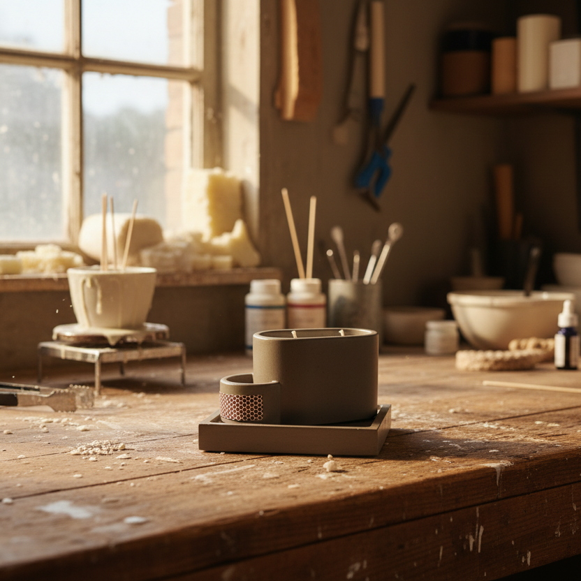 În atelierul nostru, magia nu începe cu parfumul, ci cu materia brută. Turnăm fiecare vas manual, transformând praful ceramic într-o formă fină, cu un design minimalist care să îmbrățișeze orice colț al casei tale.